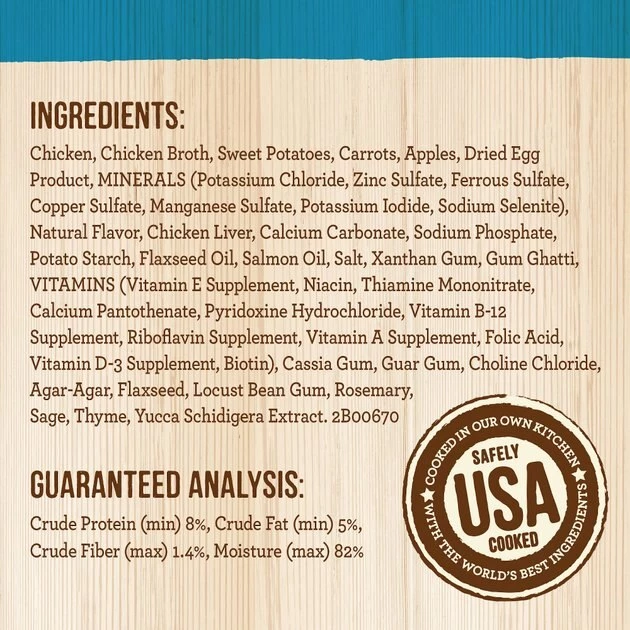 Chicken, Chicken Broth, Sweet Potatoes, Carrots, Apples, Dried Egg Product, Minerals (Potassium Chloride, Zinc Sulfate, Ferrous Sulfate, Copper Sulfate, Manganese Sulfate, Potassium Iodide, Sodium Selenite), Natural Flavor, Chicken Liver, Calcium Carbonate, Sodium Phosphate, Potato Starch, Flaxseed Oil, Salmon Oil, Salt, Xanthan Gum, Gum Ghatti, Vitamins (Vitamin E Supplement, Niacin, Thiamine Mononitrate, Calcium Pantothenate, Pyridoxine Hydrochloride, Vitamin B-12 Supplement, Riboflavin Supplement, Vitamin A Supplement, Folic Acid, Vitamin D-3 Supplement, Biotin), Cassia Gum, Guar Gum, Choline Chloride, Agar-Agar, Flaxseed, Locust Bean Gum, Rosemary, Sage, Thyme, Yucca Schidigera Extract. 2B00670.