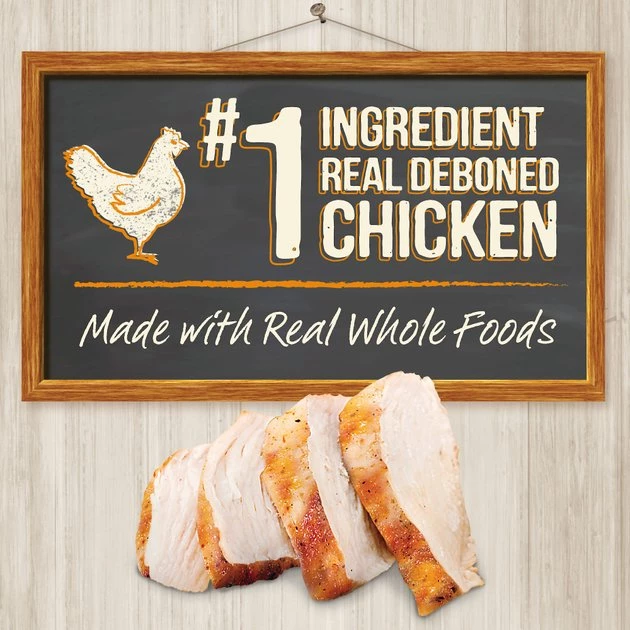 Deboned Chicken, Chicken Meal, Brown Rice, Oatmeal, Barley, Turkey Meal, Chicken Fat, Quinoa, Natural Flavor, Flaxseed, Salmon Oil, Potassium Chloride, Salt, Apples, Carrots, Sunflower Oil, Organic Dehydrated Alfalfa Meal, Choline Chloride, Minerals (Iron Amino Acid Complex, Zinc Amino Acid Complex, Zinc Sulfate, Sodium Selenite, Manganese Amino Acid Complex, Copper Amino Acid Complex, Potassium Iodide, Cobalt Proteinate, Cobalt Carbonate), Taurine, Yucca Schidigera Extract, Mixed Tocopherols for freshness, Vitamins (Vitamin E Supplement, Vitamin B12 Supplement, Riboflavin Supplement, Vitamin A Acetate, d-Calcium Pantothenate, Thiamine Mononitrate, Folic Acid, Niacin, Biotin, Pyridoxine Hydrochloride, Vitamin D3 Supplement), Citric Acid for freshness, Dried Lactobacillus plantarum Fermentation Product, Dried Lactobacillus casei Fermentation Product, Dried Enterococcus faecium Fermentation Product, Dried Lactobacillus acidophilus Fermentation Product. 2A32002