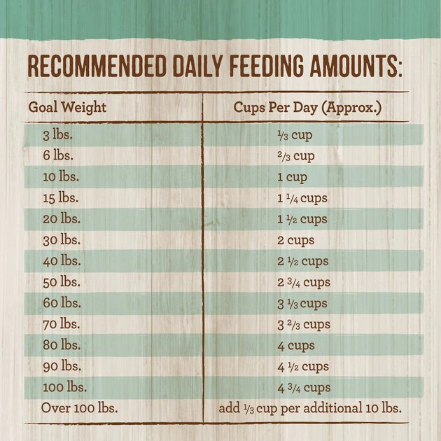 | 100 + lbs | 4 3/4 + 1/3 cup for each additional 10 lbs |