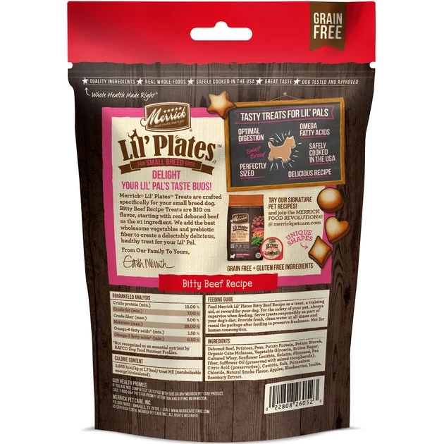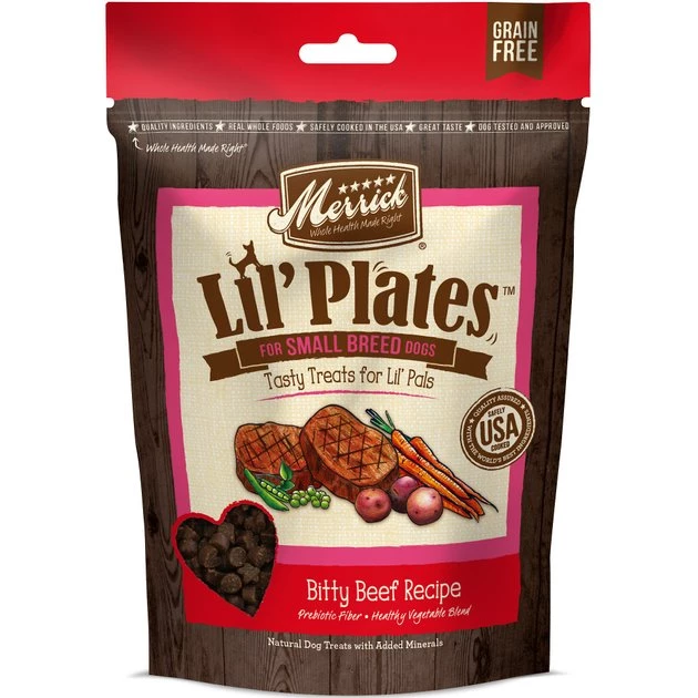 Merrick Lil’ Plates Bitty Beef Recipe Grain Free Small Breed Dog Treats are big on beefy flavor and protein, but small in size for your dog’s tiny mouth. The number one ingredient in these naturally healthy soft dog treats is real deboned beef, plus a heaping helping of wholesome vegetables for wag-worthy taste. With prebiotic fiber for optimal digestion, and omega fatty acids for skin and coat support—they contain no artificial flavors, colors or preservatives—and no gluten or grain. Formulated specifically for small breed adult dogs, these perfectly sized bites come in a number of fun shapes to make treat time extra exciting—plus, they are crafted in Merrick’s Hereford, Texas kitchen and cooked in the USA.