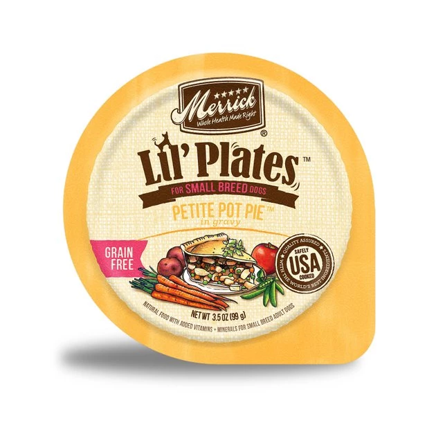 Give your little guy his own personal chicken pot pie with Merrick Lil’ Plates Grain Free Small Breed Wet Dog Food Petite Pot Pie. This delicious wet food for small dogs features real deboned chicken as the very first ingredient. It’s crafted with a savory gravy and formulated for complete and balanced nutrition with prebiotics, probiotics and essential minerals to aid in digestion. This grain and gluten-free wet dog food is developed with high levels of omega fatty acids to help promote healthy skin and a shiny coat while glucosamine and chondroitin support hip and joint function. It’s paw-fect for helping small breeds of dogs in any stage of life build healthy muscles and maintain a high level of energy throughout the day.