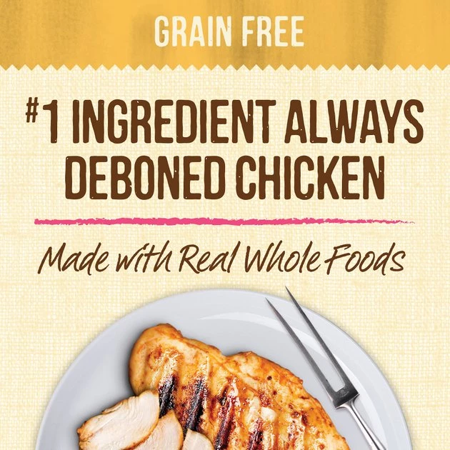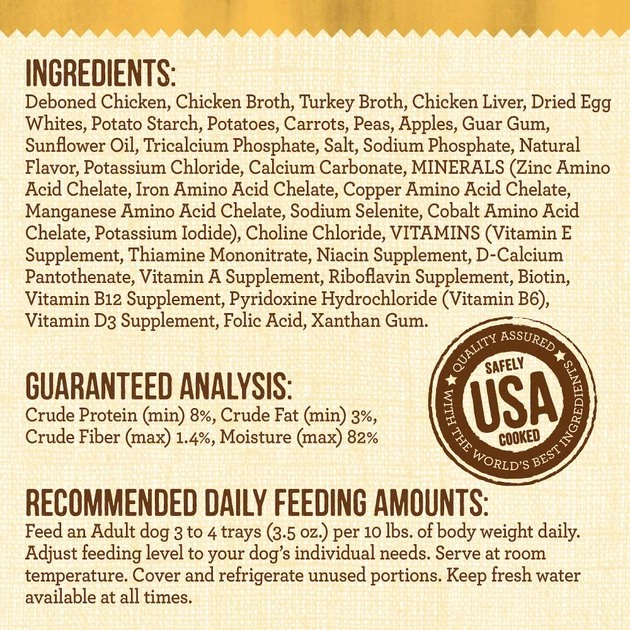 Deboned Chicken, Chicken Broth, Turkey Broth, Chicken Liver, Dried Egg Whites, Potato Starch, Potatoes, Carrots, Peas, Apples, Guar Gum, Sunflower Oil, Tricalcium Phosphate, Salt, Sodium Phosphate, Natural Flavor, Potassium Chloride, Calcium Carbonate, Minerals (Zinc Amino Acid Chelate, Iron Amino Acid Chelate, Copper Amino Acid Chelate, Manganese Amino Acid Chelate, Sodium Selenite, Cobalt Amino Acid Chelate, Potassium Iodide), Choline Chloride, Vitamins (Vitamin E Supplement, Thiamine Mononitrate, Niacin Supplement, D-Calcium Pantothenate, Vitamin A Supplement, Riboflavin Supplement, Biotin, Vitamin B12 Supplement, Pyridoxine Hydrochloride (Vitamin B6), Vitamin D3 Supplement, Folic Acid), Xanthan Gum.