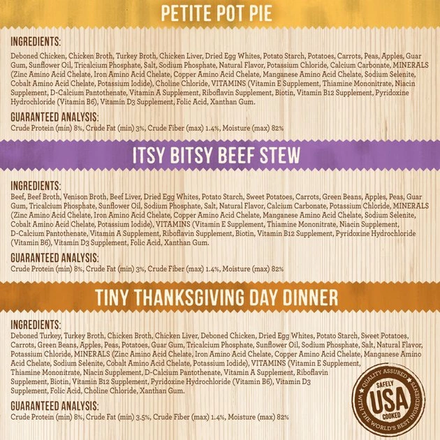 Itsy Bitsy Beef Stew: Beef, Beef Broth, Venison Broth, Beef Liver, Dried Egg Whites, Potato Starch, Sweet Potatoes, Carrots, Green Beans, Apples, Peas, Guar Gum, Sunflower Oil, Sodium Phosphate, Salt, Natural Flavor, Potassium Chloride, Minerals (Zinc Amino Acid Chelate, Iron Amino Acid Chelate, Copper Amino Acid Chelate, Manganese Amino Acid Chelate, Sodium Selenite, Cobalt Amino Acid Chelate, Potassium Iodide), Cinnamon, Choline Chloride, Vitamins (Vitamin E Supplement, Thiamine Mononitrate, Niacin Supplement, D-Calcium Pantothenate, Vitamin A Supplement, Riboflavin Supplement, Biotin, Vitamin B12 Supplement, Pyridoxine Hydrochloride, Vitamin D3 Supplement, Folic Acid), Tricalcium Phosphate, Xanthan Gum.