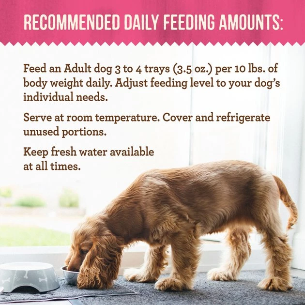 Feed an Adult dog 3 – 4 bowls (3.5 oz) per 10 – lbs of body weight daily. Adjust feeding level to your dog’s individual needs. Serve at room temperature. Cover and refrigerate unused portions. Keep fresh water available at all times.