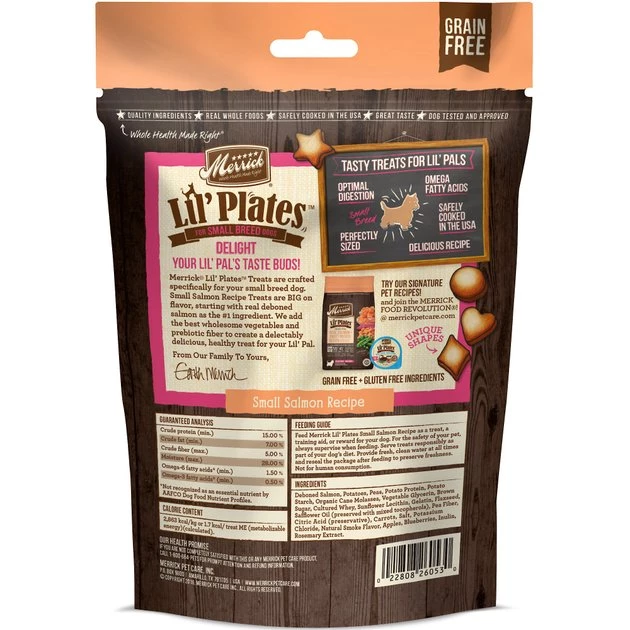 - Real deboned salmon is the first ingredient in these grain-free small dog treats.