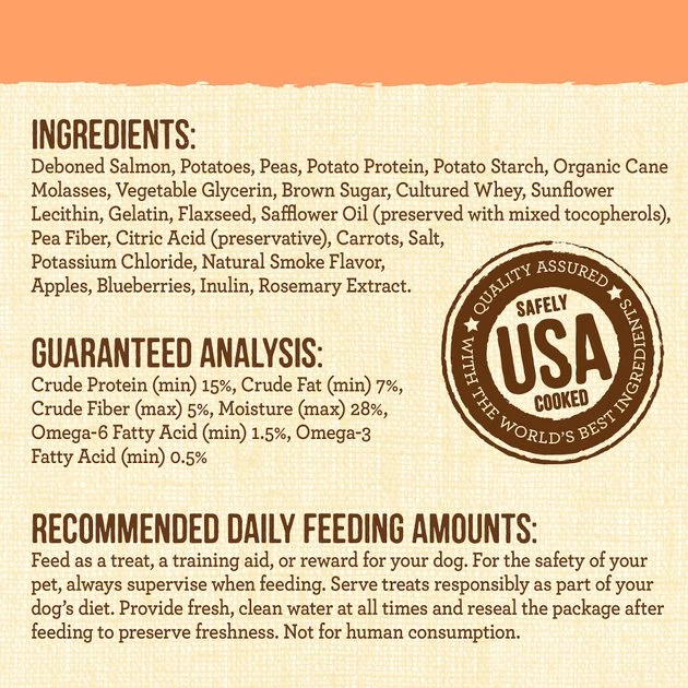 Deboned Salmon, Potatoes, Peas, Potato Protein, Potato Starch, Organic Cane Molasses, Vegetable Glycerin, Brown Sugar, Cultured Whey, Sunflower Lecithin, Gelatin, Flaxseed, Safflower Oil (preserved with mixed tocopherols), Pea Fiber, Citric Acid (preservative), Carrots, Salt, Potassium Chloride, Natural Smoke Flavor, Apples, Blueberries, Inulin, Rosemary Extract.
