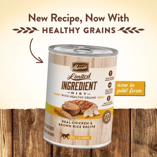 Crafted with a limited number of carefully selected ingredients, Merrick Limited Ingredient Diet Healthy Grains Wet Dog Food Real Chicken Recipe is specially formulated for your sensitive sidekick. Real, deboned chicken is the first ingredient, providing a single source of protein as well as essential amino acids, vitamins and minerals to help your doggo thrive. This complete and balanced recipe contains no chickpeas, lentils or peas. It’s also made without soy, corn, potato, dairy, eggs or artificial colors, preservatives or flavors. The special blend of wholesome grains gives your buddy the fiber he needs for a healthy digestive system in a tasty, moist texture he won’t be able to resist.