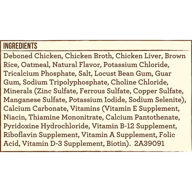 Deboned Chicken, Chicken Broth, Chicken Liver, Brown Rice, Oatmeal, Natural Flavor, Potassium Chloride, Tricalcium Phosphate, Salt, Locust Bean Gum, Guar Gum, Sodium Tripolyphosphate, Choline Chloride, Minerals (Zinc Sulfate, Ferrous Sulfate, Copper Sulfate, Manganese Sulfate, Potassium Iodide, Sodium Selenite), Calcium Carbonate, Vitamins (Vitamin E Supplement, Niacin, Thiamine Mononitrate, Calcium Pantothenate, Pyridoxine Hydrochloride, Vitamin B-12 Supplement, Riboflavin Supplement, Vitamin A Supplement, Folic Acid, Vitamin D-3 Supplement, Biotin).