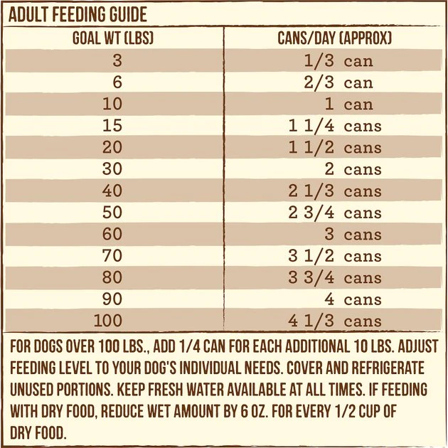 For dogs over 100 lbs., add 1/4 can for each additional 10 lbs. Adjust feeding level to your dog’s individual needs. Cover and refrigerate unused portions. Keep fresh water available at all times. If feeding with dry food, reduce wet amount by 6 oz. for every 1/2 cup of dry food.