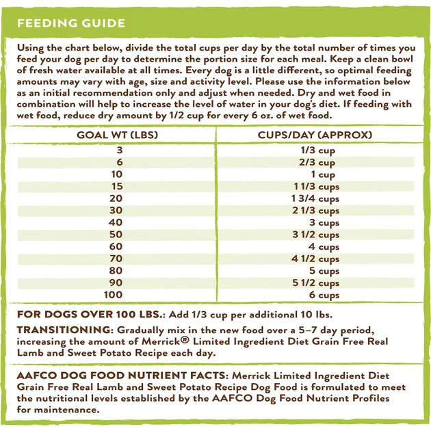 Gradually mix in the new food over a 5 – 7 day period, increasing the amount of Merrick Limited Ingredient Diet Grain Free Real Lamb and Sweet Potato Recipe each day.