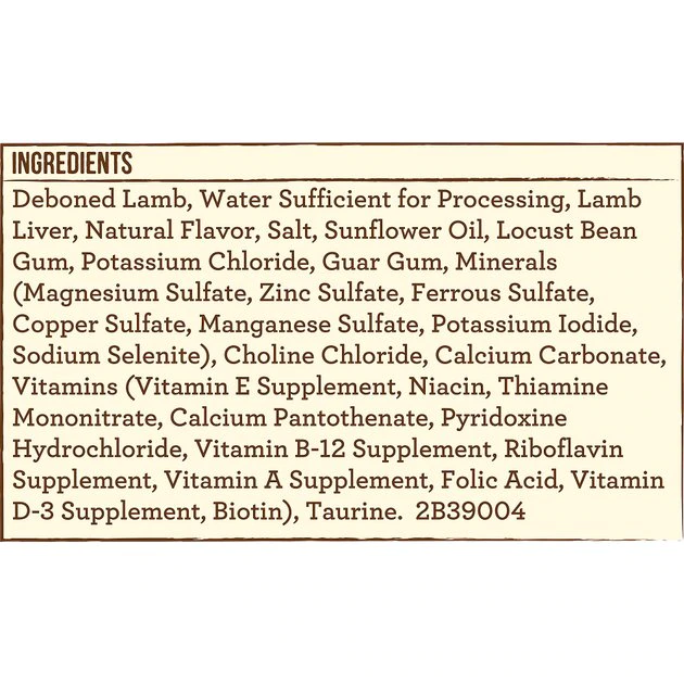 Deboned Lamb, Water Sufficient for Processing, Lamb Liver, Natural Flavor, Salt, Sunflower Oil, Locust Bean Gum, Potassium Chloride, Guar Gum, Minerals (Magnesium Sulfate, Zinc Sulfate, Ferrous Sulfate, Copper Sulfate, Manganese Sulfate, Potassium Iodide, Sodium Selenite), Choline Chloride, Calcium Carbonate, Vitamins (Vitamin E Supplement, Niacin, Thiamine Mononitrate, Calcium Pantothenate, Pyridoxine Hydrochloride, Vitamin B-12 Supplement, Riboflavin Supplement, Vitamin A Supplement, Folic Acid, Vitamin D-3 Supplement, Biotin), Taurine. 2B39004.
