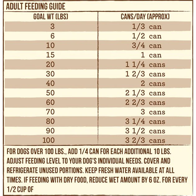 If feeding with dry food, reduce wet amount by 6 oz. for every 1/2 cup of dry food.
