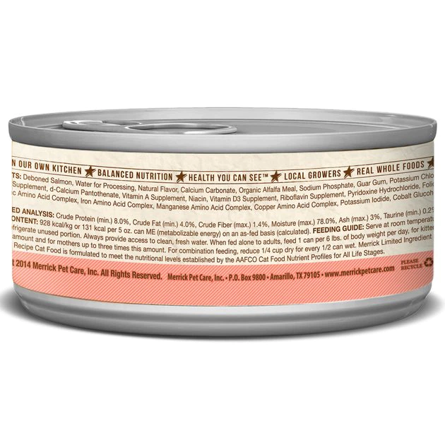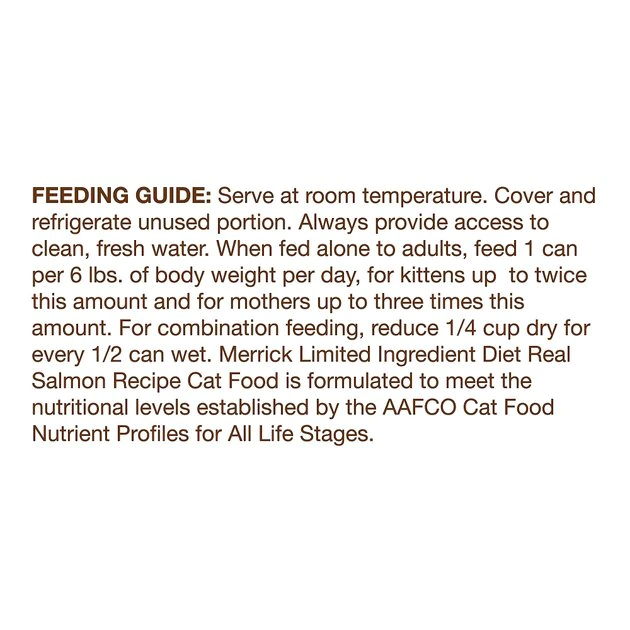 Give your sensitive kitty the simple nutrition he needs with the Merrick Limited Ingredient Diet Grain-Free Real Salmon Pate Recipe Canned Cat Food. It’s packed with high-protein, tender salmon as the first ingredient and only animal protein source, and prepared into a whisker-licking pate even picky eaters love. Loaded with antioxidants to support immunity, omegas for a healthy skin and coat, plus vitamins, minerals and taurine in every bite, it’s sure to fuel all your kitty’s adventures, and then yum! Plus, it has zero grains, artificial colors, flavors or preservatives so you can let kitty dive right into his bowl every time.