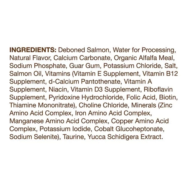 Deboned Salmon, Water for Processing, Natural Flavor, Calcium Carbonate, Organic Alfalfa Meal, Sodium Phosphate, Guar Gum, Potassium Chloride, Salt, Salmon Oil, Vitamins (Vitamin E Supplement, Vitamin B12 Supplement, D-Calcium Pantothenate, Vitamin A Supplement, Niacin, Vitamin D3 Supplement, Riboflavin Supplement, Pyridoxine Hydrochloride, Folic Acid, Biotin, Thiamine Mononitrate), Choline Chloride, Minerals (Zinc Amino Acid Complex, Iron Amino Acid Complex, Manganese Amino Acid Complex, Copper Amino Acid Complex, Potassium Iodide, Cobalt Glucoheptonate, Sodium Selenite), Taurine, Yucca Schidigera Extract.