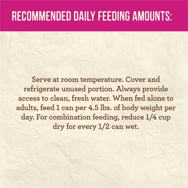 Serve at room temperature. Cover and refrigerate unused portion. Always provide access to clean, fresh water. When fed alone to adults, feed 1 can per 4.5 lbs. of body weight per day. For combination feeding, reduce 1/4 cup dry for every 1/2 can wet.