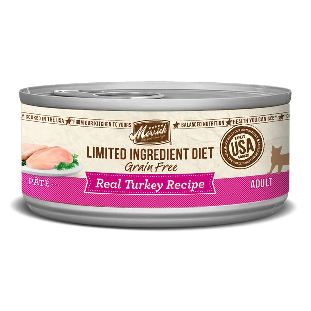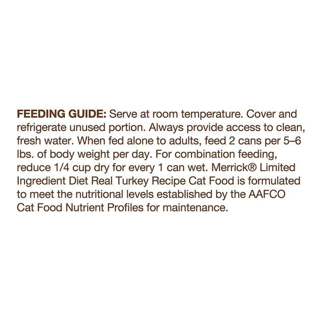 Give your sensitive kitty the simple nutrition she needs with Merrick’s Limited Ingredient Diet Grain-Free Turkey recipe. This canned cat food was specially crafted with a limited number of carefully selected ingredients so that adult cats with food sensitivities can get the complete and balanced nutrition they need. It’s made with a single-source animal protein, easily digestible carbohydrates and never contains any grains, corn or gluten! Plus, it includes taurine—an amino acid that helps to support your pal’s overall health. So, serve it on its own or with your cat’s favorite kibble and reward her with a meal you both can feel good about!