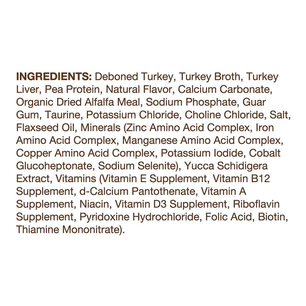 Deboned Turkey, Turkey Broth, Turkey Liver, Pea Protein, Natural Flavor, Calcium Carbonate, Organic Dried Alfalfa Meal, Sodium Phosphate, Guar Gum, Taurine, Potassium Chloride, Choline Chloride, Salt, Flaxseed Oil, Minerals (Zinc Amino Acid Complex, Iron Amino Acid Complex, Manganese Amino Acid Complex, Copper Amino Acid Complex, Potassium Iodide, Cobalt Glucoheptonate, Sodium Selenite), Yucca Schidigera Extract, Vitamins (Vitamin E Supplement, Vitamin B12 Supplement, d-Calcium Pantothenate, Vitamin A Supplement, Niacin, Vitamin D3 Supplement, Riboflavin Supplement, Pyridoxine Hydrochloride, Folic Acid, Biotin, Thiamine Mononitrate).