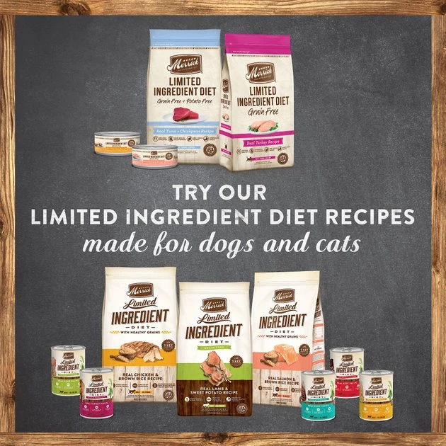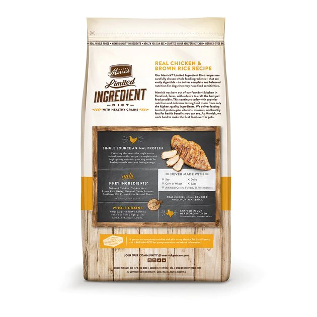 Keep your furry buddy’s tummy from feeling crummy with Merrick Limited Ingredient Diet Dry Dog Food Real Chicken & Brown Rice Recipe with Healthy Grains. This limited-ingredient dry food for dogs is specially formulated for sensitive stomachs—using only nine key components to deliver complete and balanced nutrition. It features real deboned chicken as the very first ingredient and single source of protein along with a high-quality blend of wholesome grains. This limited-ingredient dry dog food is developed to deliver important amino acids, vitamins and minerals to your mate and does not contain any chickpeas, lentils, peas, soy, corn, wheat, dairy, eggs or artificial colors, preservatives or flavors. It’s paw-fect for all breeds of adult dogs with food sensitivities or allergies.