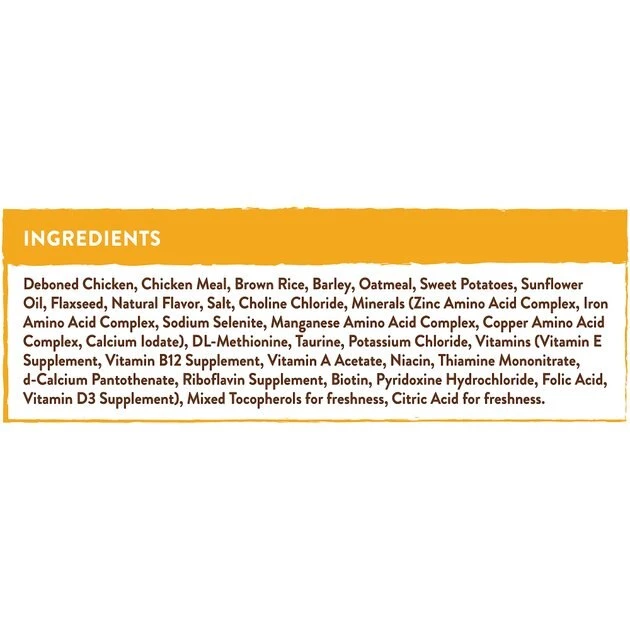Deboned Chicken, Chicken Meal, Brown Rice, Barley, Oatmeal, Sweet Potatoes, Sunflower Oil, Flaxseed, Natural Flavor, Salt, Choline Chloride, Minerals (Zinc Amino Acid Complex, Iron Amino Acid Complex, Sodium Selenite, Manganese Amino Acid Complex, Copper Amino Acid Complex, Calcium Iodate), DL- Methionine, Taurine, Potassium Chloride, Vitamins (Vitamin E Supplement, Vitamin B12 Supplement, Vitamin A Acetate, Niacin, Thiamine Mononitrate, d- Calcium Pantothenate, Riboflavin Supplement, Biotin, Pyridoxine Hydrochloride, Folic Acid, Vitamin D3 Supplement), Mixed Tocopherols for freshness, Citric Acid for freshness.