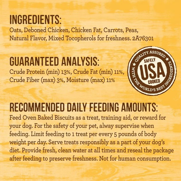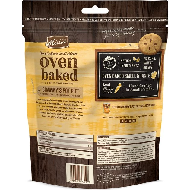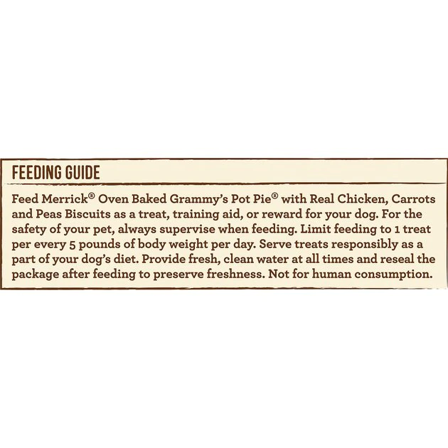Feed Grammy’s Pot Pie with Real Chicken, Peas & Carrots Biscuits as a treat, training aid, or reward for your dog. For the safety of your pet, always supervise when feeding. Limit feeding 1 treat per every 5 pounds of body weight per day. Serve treats responsibily as a part of your dog’s diet. Provide fresh, clean water at all times and reseal the package after feeding to preserve freshness. Not for human consumption.