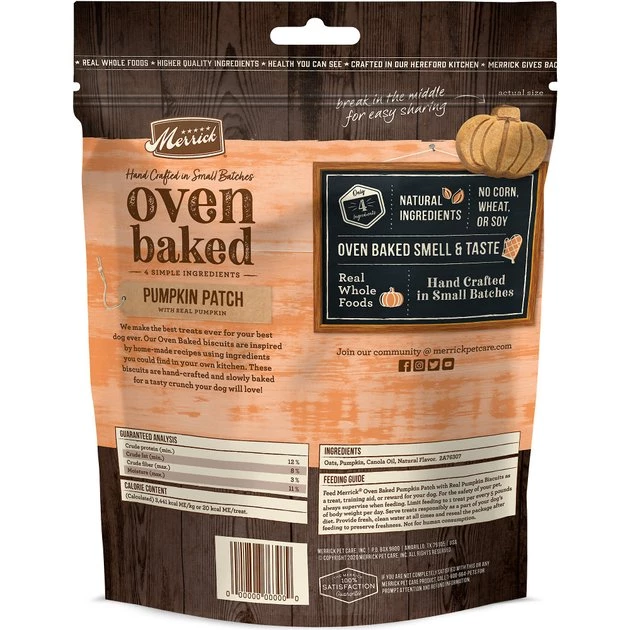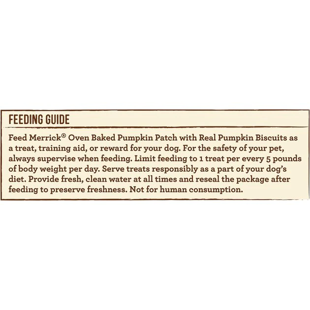 Feed Pumpkin Patch with Real Pumpkin Biscuits as a treat, training aid, or reward for your dog. For the safety of your pet, always supervise when feeding. Limit feeding 1 treat per every 5 pounds of body weight per day. Serve treats responsibily as a part of your dog’s diet. Provide fresh, clean water at all times and reseal the package after feeding to preserve freshness. Not for human consumption.