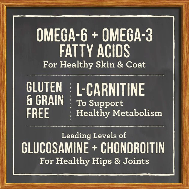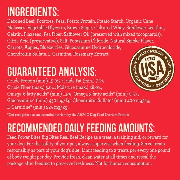 Deboned Beef, Potatoes, Peas, Potato Protein, Potato Starch, Organic Cane Molasses, Vegetable Glycerin, Brown Sugar, Cultured Whey, Sunflower Lecithin, Gelatin, Flaxseed, Pea Fiber, Safflower Oil (preserved with mixed tocopherols), Citric Acid (preservative), Salt, Potassium Chloride, Natural Smoke Flavor, Carrots, Apples, Blueberries, Glucosamine Hydrochloride, Chondroitin Sulfate, L-Carnitine, Rosemary Extract.