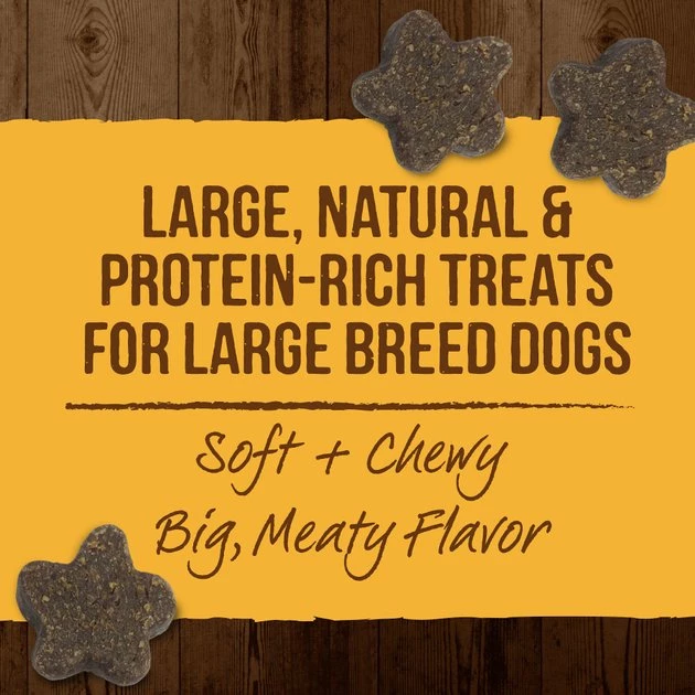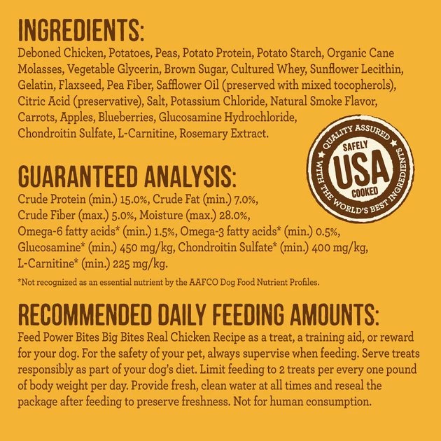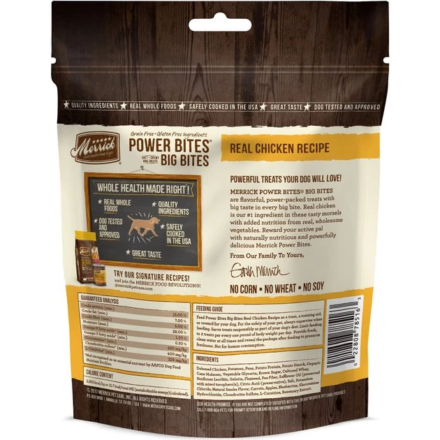 For powerfully meaty flavor and protein, choose Merrick Power Bites Dog Treats Big Bites, Real Chicken Recipe. Crafted especially for large breed dogs, these soft and chewy dog treats have a big meaty taste, and lots of protein in every bite. They start with real deboned chicken to build and maintain muscle tissue and healthy energy levels. Glucosamine and chondroitin help your big dog maintain healthy hips and joints, while L-carnitine in the recipe supports a healthy metabolism. These chicken treats also have omega fatty acids for skin and coat support. Made with natural ingredients and no artificial flavors, colors or preservatives—they contain no corn, soy, wheat, grain or gluten. Crafted in Merrick’s Hereford, Texas kitchen, these bites make the perfect reward or training treat for your big best friend!