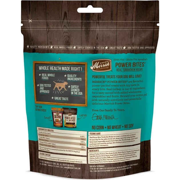 Merrick Power Bites Turducken Recipe Grain-Free Soft & Chewy Dog Treats are natural, meaty rewards that are crafted with real, deboned turkey first. These protein-rich goodies help build and maintain healthy muscle tissue and energy levels and they contain omega fatty acids for skin and coat health. These adult dog treats are crafted with natural ingredients like turkey, duck and chicken and are 100% free from artificial flavors, colors and preservatives. You also won’t find any corn, soy, what or gluten in these grain-free treats! Like all Merrick recipes, these treats are crafted in Merrick’s Hereford, TX kitchen and cooked in the USA, in facilities that uphold strict FDA guidelines.
