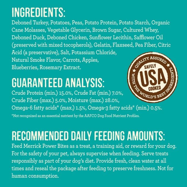 Feed Merrick Power Bites as a treat, a training aid, or reward for your dog. For the safety of your pet, always supervise when feeding. Serve treats responsibly as part of your dog’s diet. Provide fresh, clean water at all times and reseal the package after feeding to preserve freshness. Not for human consumption.