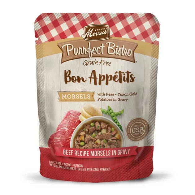 Treat your tabby to the mouthwatering, meaty morsels found in Merrick’s Purrfect Bistro Bon Appetits Grain-Free Beef Recipe Morsels in Gravy! Every purchase comes with 24 adult cat food pouches filled with a wholesome grain-free recipe featuring ingredients that are safely cooked in the USA. It’s crafted with real deboned meat first, plus visible veggies like peas and yukon gold potatoes, all in a lip-smacking gravy. The gravy not only packs a punch of flavor, but it also keeps your purring pal hydrated by providing her with 25% of her daily water intake. These pouches are the paw-fect tasty addition to your feline friend’s regular complete and balanced diet.