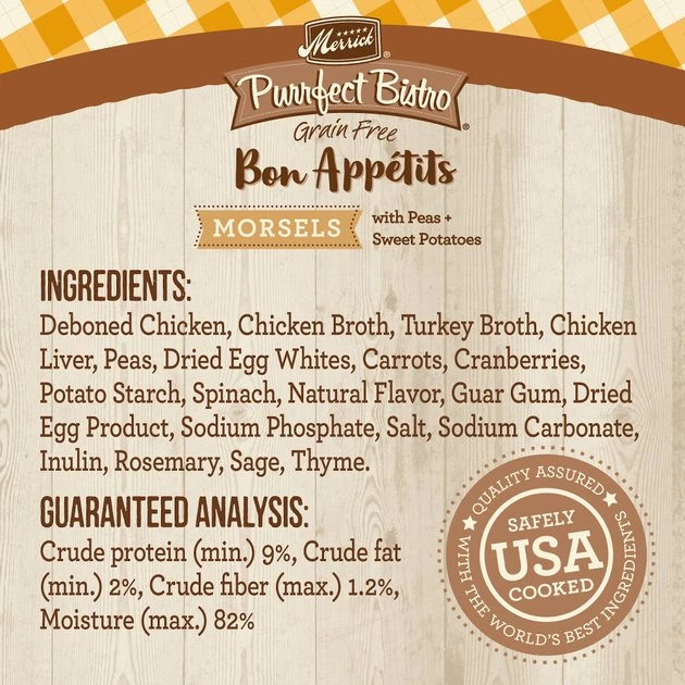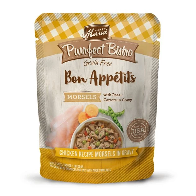 Treat your tabby to the mouthwatering, meaty morsels found in Merrick’s Purrfect Bistro Bon Appetits Grain-Free Chicken Recipe Morsels in Gravy! Every purchase comes with 24 adult cat food pouches filled with a wholesome grain-free recipe featuring ingredients that are safely cooked in the USA. It’s crafted with real deboned chicken first, plus visible veggies like peas and carrots, all in a lip-smacking gravy. The gravy not only packs a punch of flavor, but it also keeps your purring pal hydrated by providing her with 25% of her daily water intake. These pouches are the paw-fect tasty addition to your feline friend’s regular complete and balanced diet.