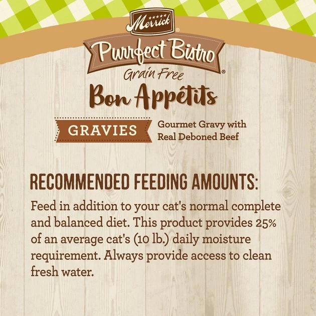 Treat your tabby to the mouthwatering taste found in Merrick’s Purrfect Bistro Bon Appetits Grain-Free Turkey Recipe Chunks in Gravy! Every purchase comes with 24 adult cat food pouches filled with a wholesome grain-free recipe featuring ingredients that are safely cooked in the USA. It’s crafted with real deboned turkey first in a lip-smacking, gourmet gravy with added minerals. The gravy not only packs a punch of flavor, but it also keeps your purring pal hydrated by providing her with 25% of her daily water intake. These pouches are the paw-fect tasty addition to your feline friend’s regular complete and balanced diet.
