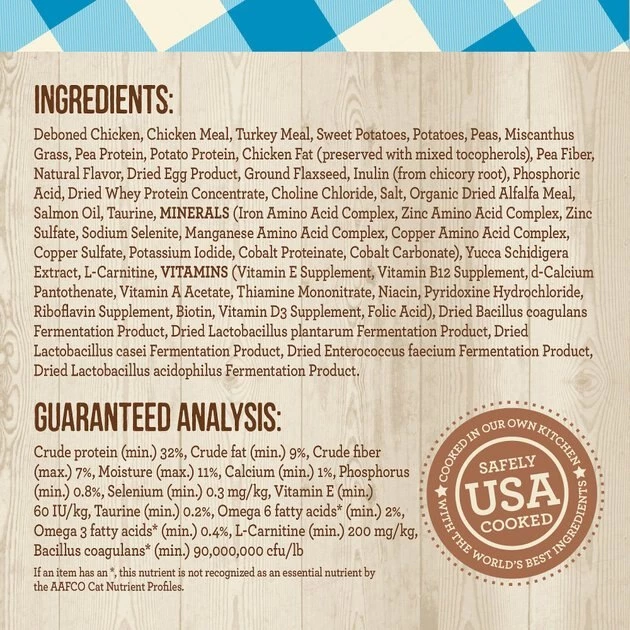 Deboned Chicken, Chicken Meal, Turkey Meal, Sweet Potatoes, Potatoes, Peas, Miscanthus Grass, Pea Protein, Potato Protein, Chicken Fat (preserved with mixed tocopherols), Pea Fiber, Natural Flavor, Dried Egg Product, Ground Flaxseed, Inulin (from chicory root), Phosphoric Acid, Dried Whey Protein Concentrate, Choline Chloride, Salt, Organic Dried Alfalfa Meal, Salmon Oil, Taurine, Minerals (Iron Amino Acid Complex, Zinc Amino Acid Complex, Zinc Sulfate, Sodium Selenite, Manganese Amino Acid Complex, Copper Amino Acid Complex, Copper Sulfate, Potassium Iodide, Cobalt Proteinate, Cobalt Carbonate), Yucca Schidigera Extract, L-Carnitine, Vitamins (Vitamin E Supplement, Vitamin B12 Supplement, d-Calcium Pantothenate, Vitamin A Acetate, Thiamine Mononitrate, Niacin, Pyridoxine Hydrochloride, Riboflavin Supplement, Biotin, Vitamin D3 Supplement, Folic Acid), Dried Bacillus coagulans Fermentation Product, Dried Lactobacillus plantarum Fermentation Product, Dried Lactobacillus casei Fermentation Product, Dried Enterococcus faecium Fermentation Product, Dried Lactobacillus acidophilus Fermentation Product.