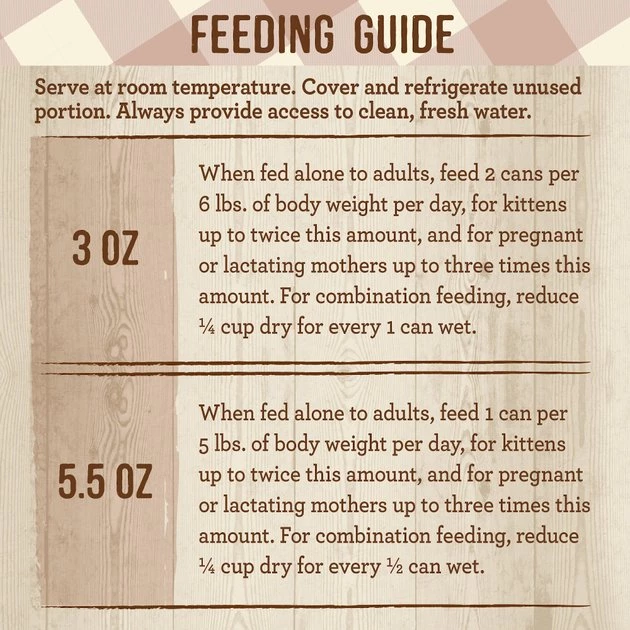 3 oz Can: Feed an Adult cat 2 can per 6 lb body weight daily.