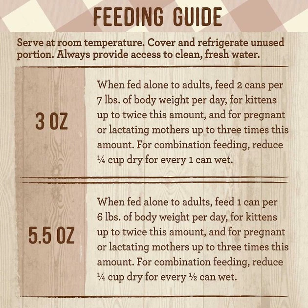 3 oz Can: Feed an Adult cat 2 can per 7 lb body weight daily.