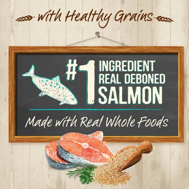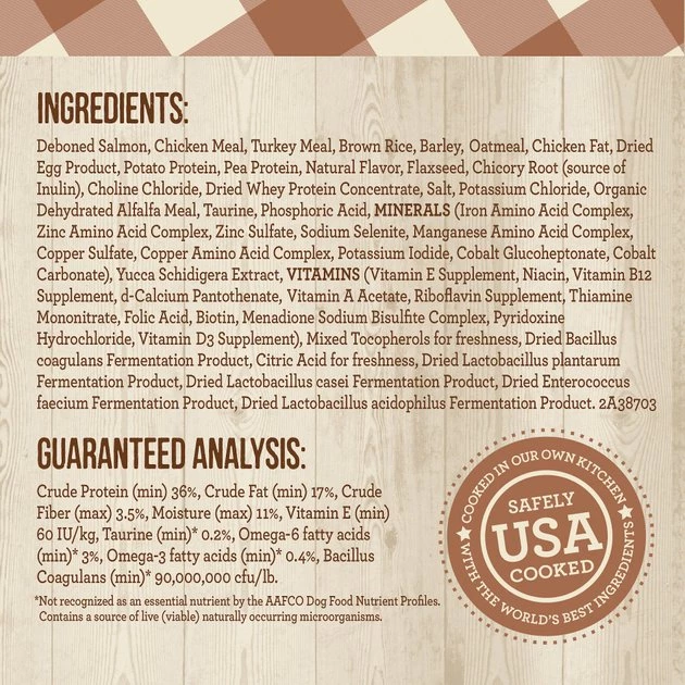 Deboned Salmon, Chicken Meal, Turkey Meal, Brown Rice, Barley, Oatmeal, Chicken Fat, Dried Egg Product, Potato Protein, Pea Protein, Natural Flavor, Flaxseed, Chicory Root (source of Inulin), Choline Chloride, Dried Whey Protein Concentrate, Salt, Potassium Chloride, Organic Dehydrated Alfalfa Meal, Taurine, Phosphoric Acid, Minerals (Iron Amino Acid Complex, Zinc Amino Acid Complex, Zinc Sulfate, Sodium Selenite, Manganese Amino Acid Complex, Copper Sulfate, Copper Amino Acid Complex, Potassium lodide, Cobalt Glucoheptonate, Cobalt Carbonate), Yucca Schidigera Extract, Vitamins (Vitamin E Supplement, Niacin, Vitamin B12 Supplement, d-Calcium Pantothenate, Vitamin A Acetate, Riboflavin Supplement, Thiamine Mononitrate, Folic Acid, Biotin, Menadione Sodium Bisulfite Complex, Pyridoxine Hydrochloride, Vitamin D3 Supplement), Mixed Tocopherols for freshness, Dried Bacillus coagulans Fermentation Product, Citric Acid for freshness, Dried Lactobacillus plantarum Fermentation Product, Dried Lactobacillus casei Fermentation Product, Dried Enterococcus faecium Fermentation Product, Dried Lactobacillus acidophilus Fermentation Product.