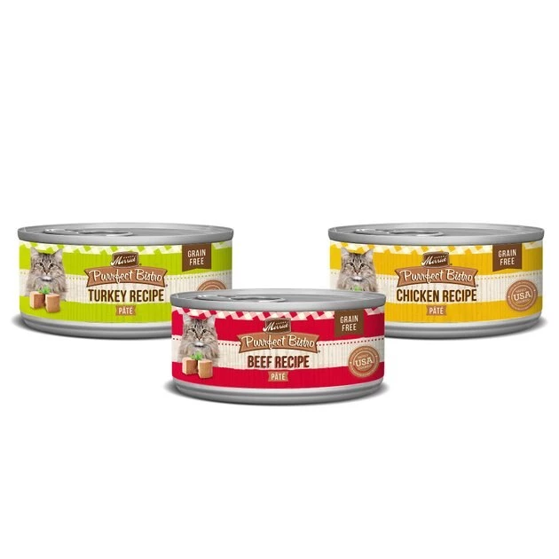 Serve up some bistro-inspired yumminess for your pal with this Merrick Purrfect Bistro Poultry & Beef Variety Pack Canned Pate Cat Food. This variety pack comes with 24 cans and three scrumptious flavors—Chicken Pate, Beef Pate and Turkey Pate. Each grain-free recipe is crafted with either real deboned poultry or beef first for the high-quality protein your purring pal deserves. And you can have extra peace of mind knowing that Merrick cat food are natural and made in the USA in Merrick’s very own kitchen without the use of artificial flavors, preservatives or colors!