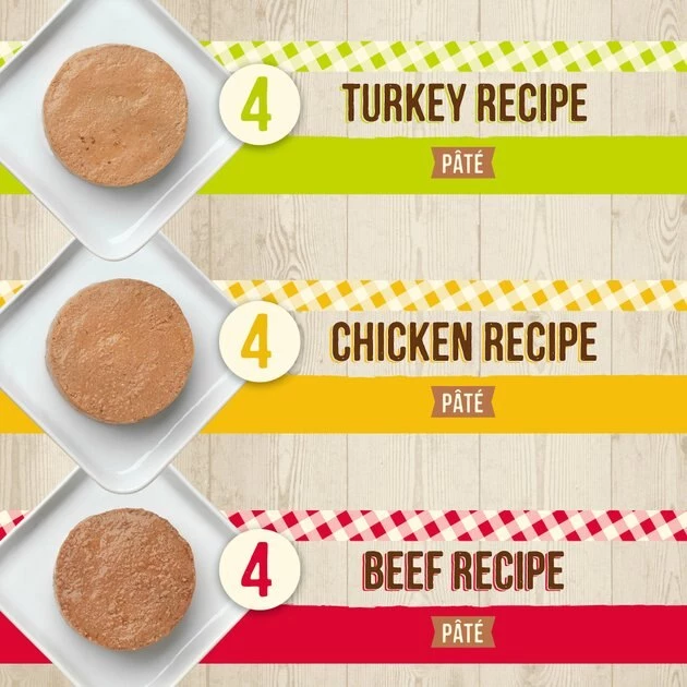 - Comes with 12 cans of Chicken Pate, 6 cans of Beef Pate and 6 cans of Turkey Pate.