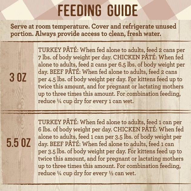 When fed alone to adults, feed 2 cans per 6.5 lbs. of body weight per day, for kittens up to twice this amount and for *pregnant or lactating mothers up to three times this amount. For combination feeding, reduce 1/4 cup dry for every 1 can wet.