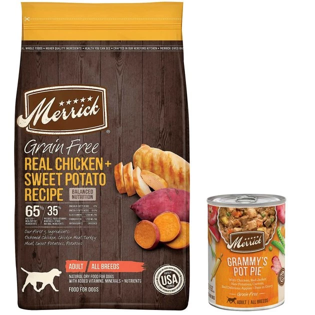Give your four-legged friend the nutrition he needs and the delicious taste he craves with Merrick Real Chicken + Sweet Potato Recipe Dry Dog Food + Wet Dog Food Grammy’s Pot Pie. This wag-worthy combo of dry and wet food features real, deboned chicken as the very first ingredient in each recipe. The kibble offers complete and balanced nutrition with 65 percent protein and healthy fat ingredients and 35 percent produce, fiber, vitamins, minerals and other natural ingredients. Glucosamine and chondroitin help maintain healthy hips and joints, while omega fatty acids support healthy skin and a shiny coat. Meanwhile, Grammy’s Pot Pie delivers red jacket potatoes, peas, carrots and red delicious apples served in a savory gravy. This wet food is free of bad stuff like artificial colors, flavors, preservatives and by-products. Plus, each can features a pull-tab for easy opening and fast serving when your furbaby just can’t wait for his food.