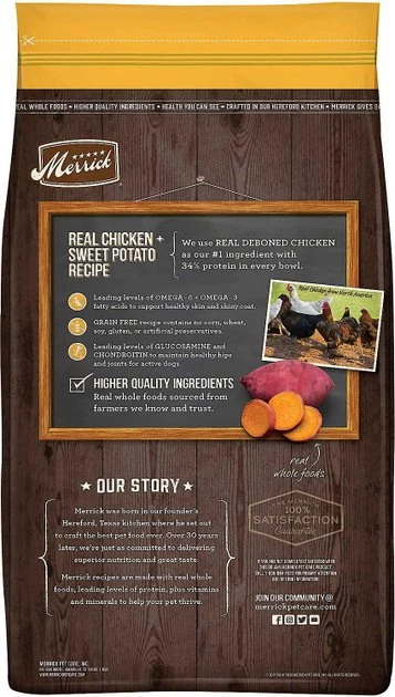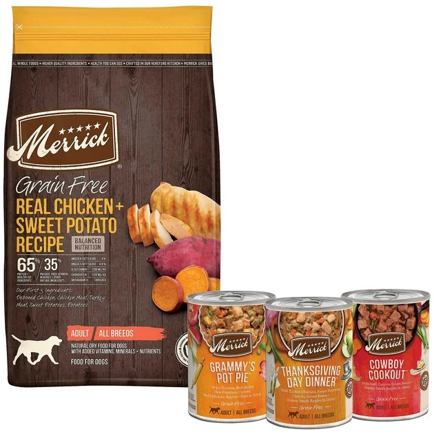 Give your four-legged friend the nutrition he needs and the delicious taste he craves with Merrick Real Chicken + Sweet Potato Recipe Dry Food + Favorites Wet Dog Food Variety Pack. The thoughtfully-crafted kibble offers complete and balanced nutrition with 65 percent protein and healthy fat ingredients plus 35 percent produce, fiber, vitamins, minerals and other natural ingredients. Glucosamine and chondroitin help maintain healthy hips and joints, while omega fatty acids support healthy skin and a shiny coat. Meanwhile, the variety pack features Grammy’s Pot Pie, Thanksgiving Day Dinner and Cowboy Cookout. Each recipe is made with real deboned beef, chicken or turkey as the very first ingredient and blended with whole foods like potatoes, carrots and apples. This wag-worthy combo is sure to have your pup begging for more!