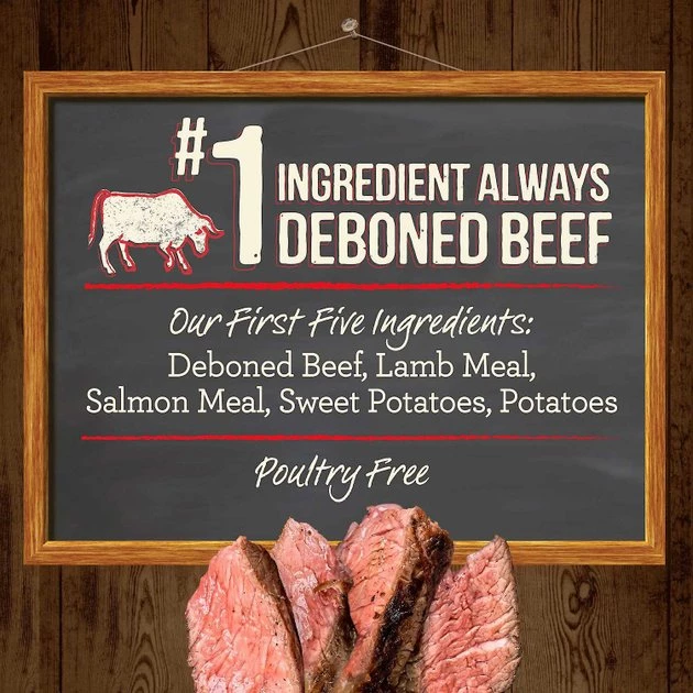 - Grain- and poultry-free kibble made with real deboned beef and sweet potato.