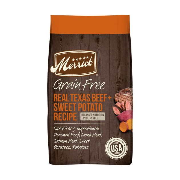 Fill your pup’s plate with a meal crafted with whole foods sourced form trusted farmers. Merrick Real Texas Beef + Sweet Potato Recipe Grain-Free Adult Dry Dog Food is a natural dog food that’s made with 65% protein and healthy fat ingredients, with deboned beef as the number one ingredient to help maintain healthy muscle tissue and energy levels. The remaining 35% consists of produce, fiber, vitamins, minerals and other natural ingredients to create a complete and balanced diet that’s paw-fect for all breeds of adult dogs. This grain-free dry dog food is developed with leading levels of omega-3 and -6 fatty acids to help promote healthy skin and a shiny coat, while glucosamine and chondroitin support hip and joint function. This kibble is made in the USA in Merrick’s very own Hereford, Texas kitchen without poultry ingredients, corn, wheat, soy, gluten or artificial preservatives.