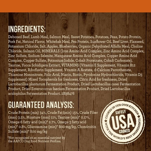 Deboned Beef, Lamb Meal, Salmon Meal, Sweet Potatoes, Potatoes, Peas, Potato Protein, Pork Fat, Natural Flavor, Whitefish Meal, Pea Protein, Sunflower Oil, Beef Liver, Flaxseed, Potassium Chloride, Salt, Apples, Blueberries, Organic Dehydrated Alfalfa Meal, Choline Chloride, Salmon Oil, Minerals (Iron Amino Acid Complex, Zinc Amino Acid Complex, Zinc Sulfate, Sodium Selenite, Manganese Amino Acid Complex, Copper Amino Acid Complex, Copper Sulfate, Potassium Iodide, Cobalt Proteinate, Cobalt Carbonate), Taurine, Yucca Schidigera Extract, Vitamins (Vitamin E Supplement, Vitamin B12 Supplement, Riboflavin Supplement, Vitamin A Acetate, d-Calcium Pantothenate, Thiamine Mononitrate, Folic Acid, Niacin, Biotin, Pyridoxine Hydrochloride, Vitamin D3 Supplement) Mixed Tocopherols for freshness, Citric Acid for freshness, Dried Lactobacillus plantarum Fermentation Product, Dried Lactobacillus casei Fermentation Product, Dried Enterococcus faecium Fermentation Product, Dried Lactobacillus acidophilus Fermentation Product.