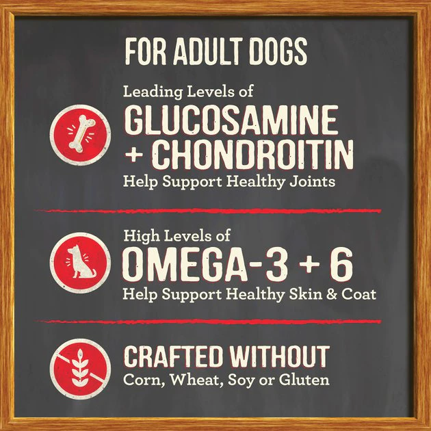 - Developed with omega fatty acids to support skin and coat health, and glucosamine and chondroitin to help maintain healthy hips and joints.